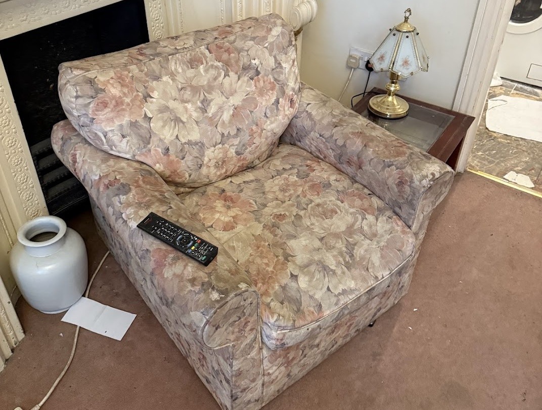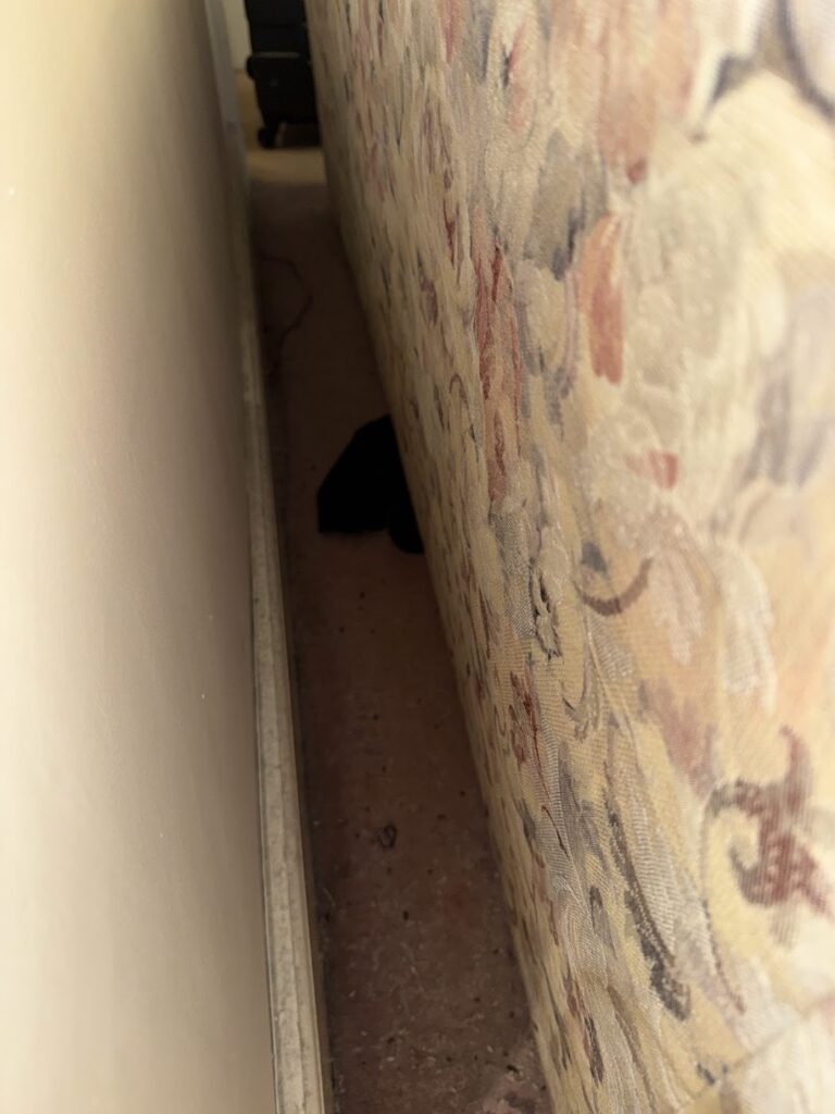 O quarto estava em estado insalubre. Cama suja, lençóis utilizados, peças íntimas atrás do sofá, embalagem aberta de lenços umedecidos, carpete com resíduos que pareciam fezes de insetos, cheiro forte, banheiro sem condições de uso e cozinha em estado precário. Registramos tudo em fotos e vídeos para garantir provas consistentes.